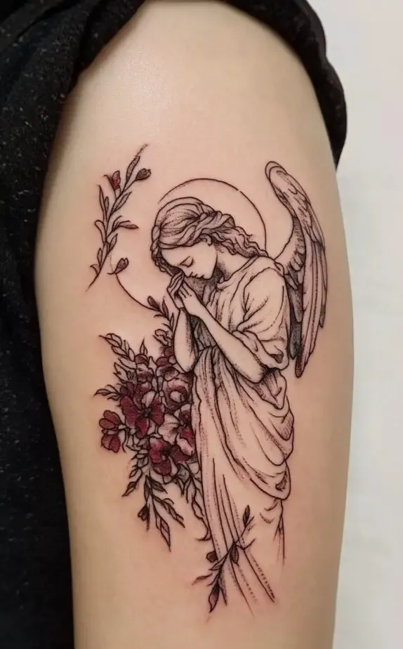This tattoo blends an angel in prayer with floral accents, creating a harmonious and spiritual design. The soft red flowers add a touch of color, enhancing the overall aesthetic.