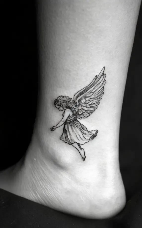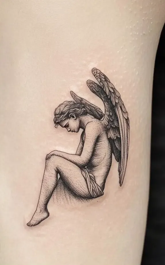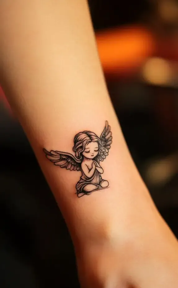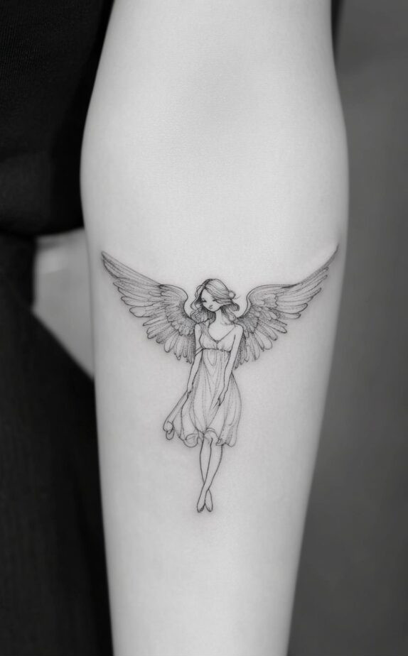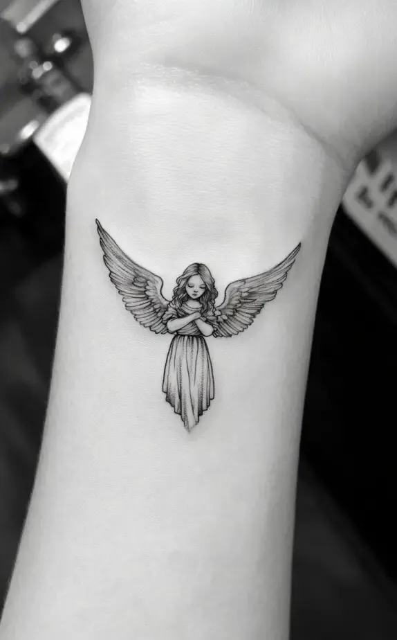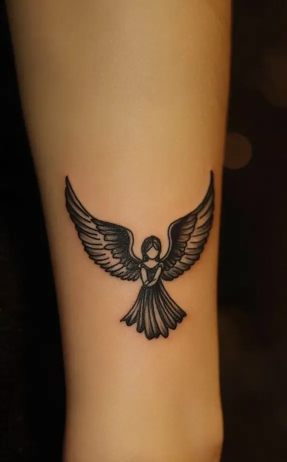 A minimalist design with a small angel figure, this tattoo highlights simplicity while retaining elegance. The angel is depicted with outstretched wings, symbolizing hope and light.