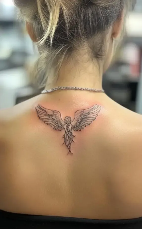 With wings stretching across the upper back, this tattoo offers a minimalist but striking design. The angel figure s body is subtle, and the wings are the main focus, symbolizing freedom and strength.