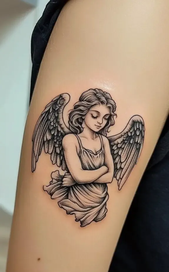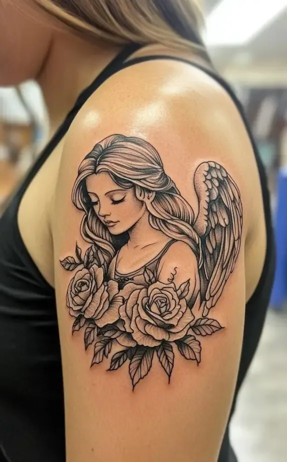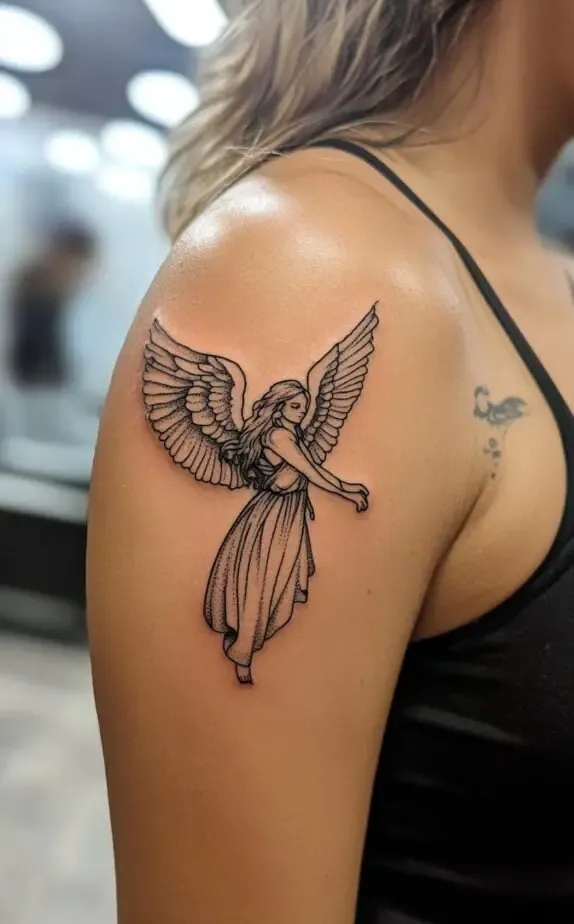 This design is a great fit for women who seek a tattoo that symbolizes guidance and protection. The placement on the shoulder enhances its symbolic meaning, as if an angel is always watching over you.