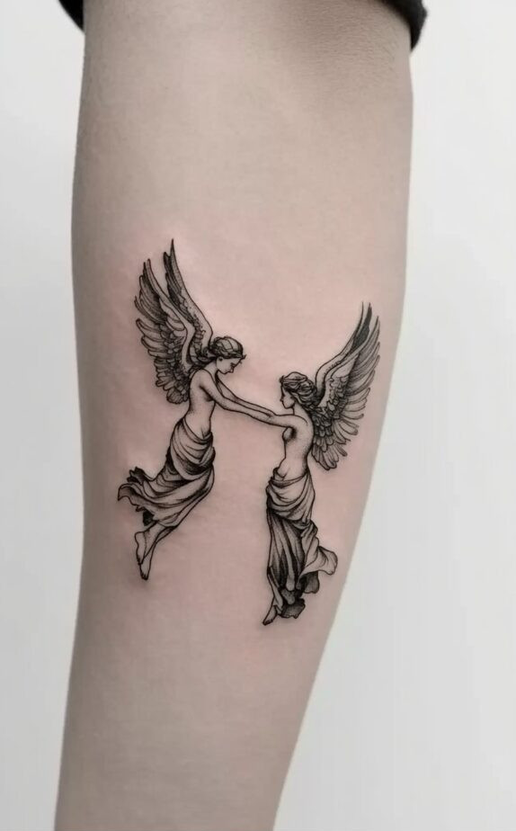 This tattoo depicts two angels holding hands in a dance-like pose. The symmetry and intricate detailing make it a unique piece full of elegance and grace.