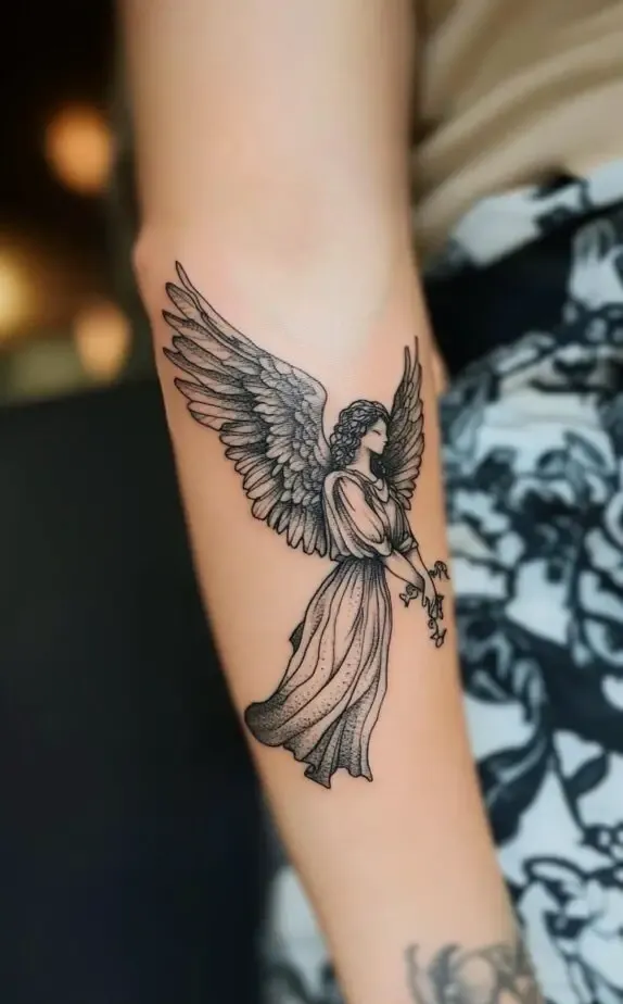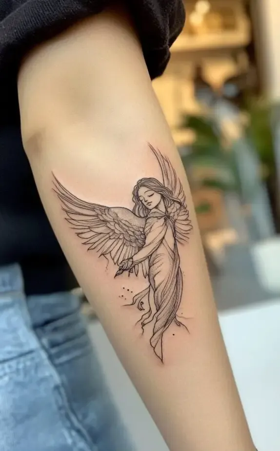 The forearm placement is perfect for showcasing the design, allowing for visibility and personal connection. It s a great choice for someone wanting a guardian angel as a protective figure.