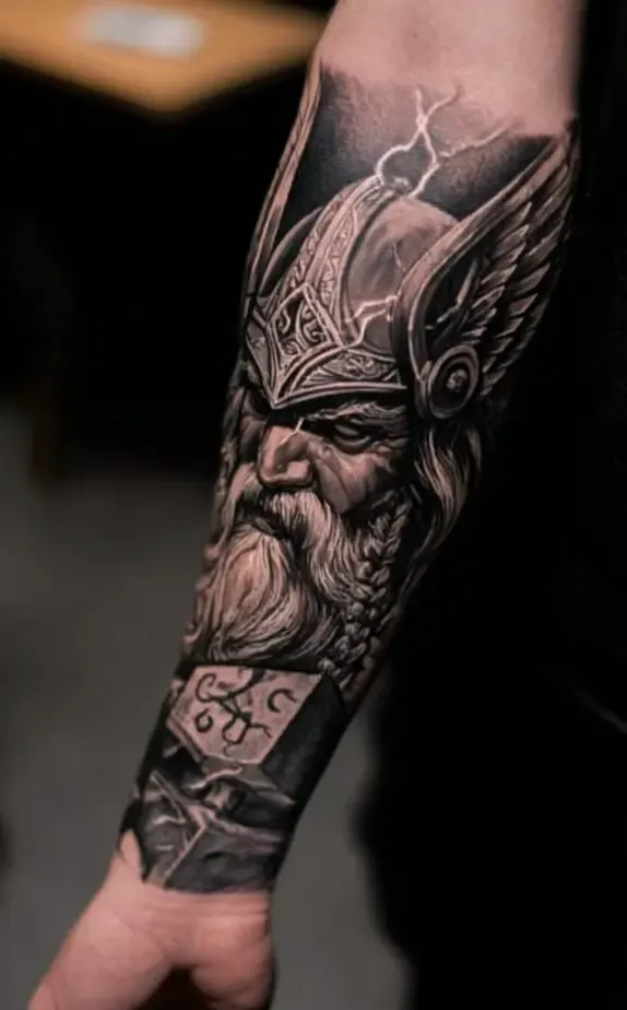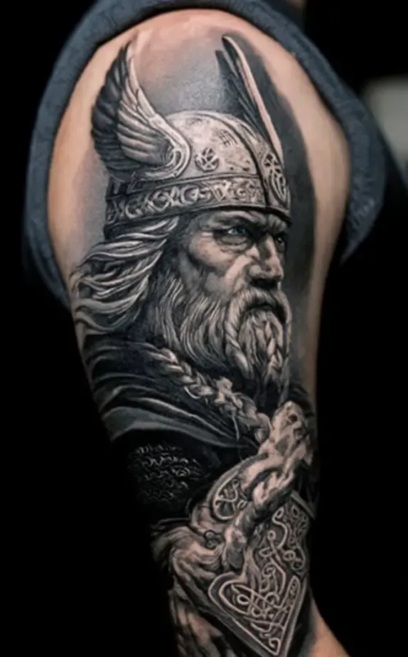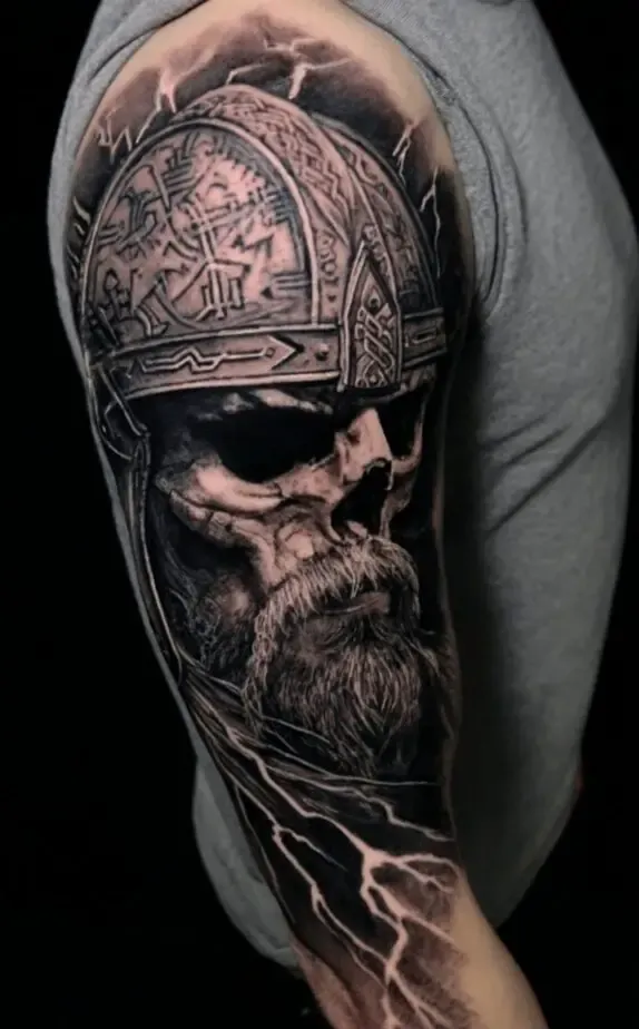 Typically rendered in bold black and grey ink, the design combines intricate linework and shading to convey both realism and mysticism. This half sleeve tattoo is perfect for men who admire Viking history and want a bold, meaningful piece that embodies resilience and warrior pride