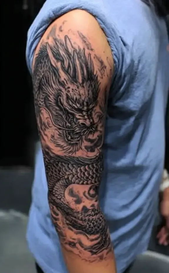 A half sleeve design featuring a dragon can showcase intricate scales, fiery breath, and dynamic poses that wrap dramatically around the arm, creating a bold and captivating visual.