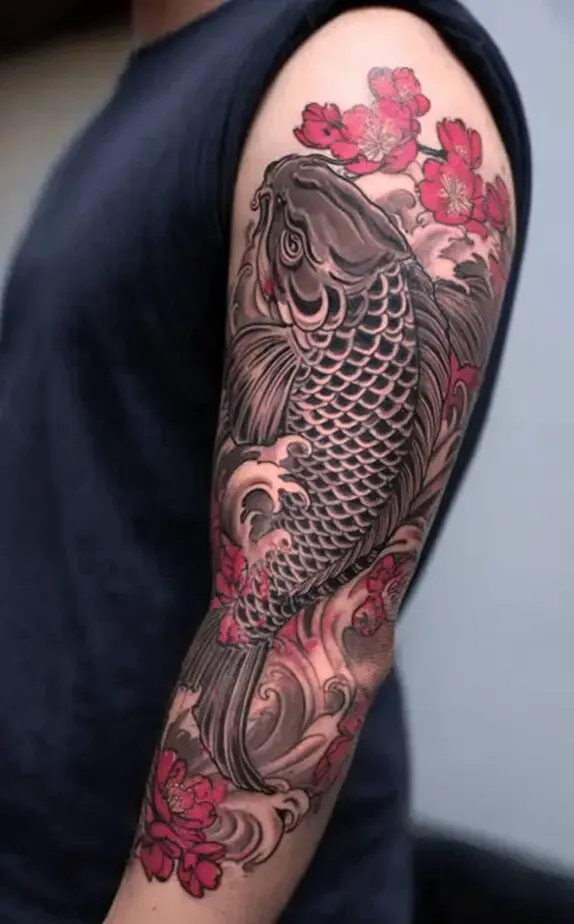 A Japanese koi fish and cherry blossom half sleeve tattoo combines powerful symbols of resilience and beauty into a harmonious and meaningful design. The koi fish represents strength, perseverance, and the ability to overcome adversity, inspired by the legend of koi swimming upstream to transform into a dragon.