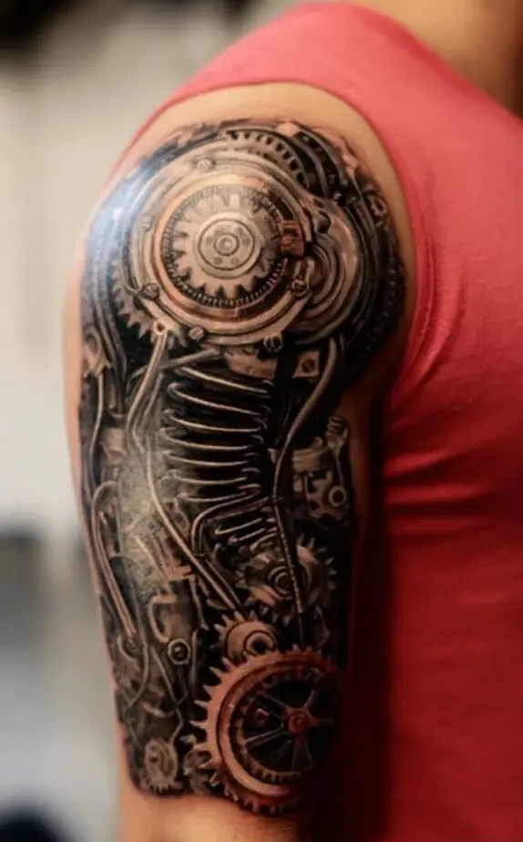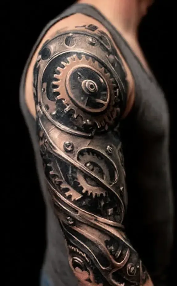 This tattoo style features intricately detailed gears, cogs, pipes, and mechanical components intertwined in a seamless design that mimics the inner workings of a complex machine.