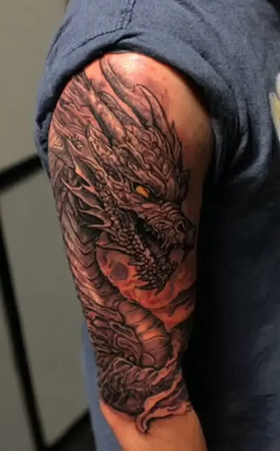 A fierce dragon half sleeve tattoo is a striking choice for men who want to symbolize power, protection, and wisdom. Dragons have long been revered in many cultures as mythical guardians of treasure and embody fierce strength and magical prowess.