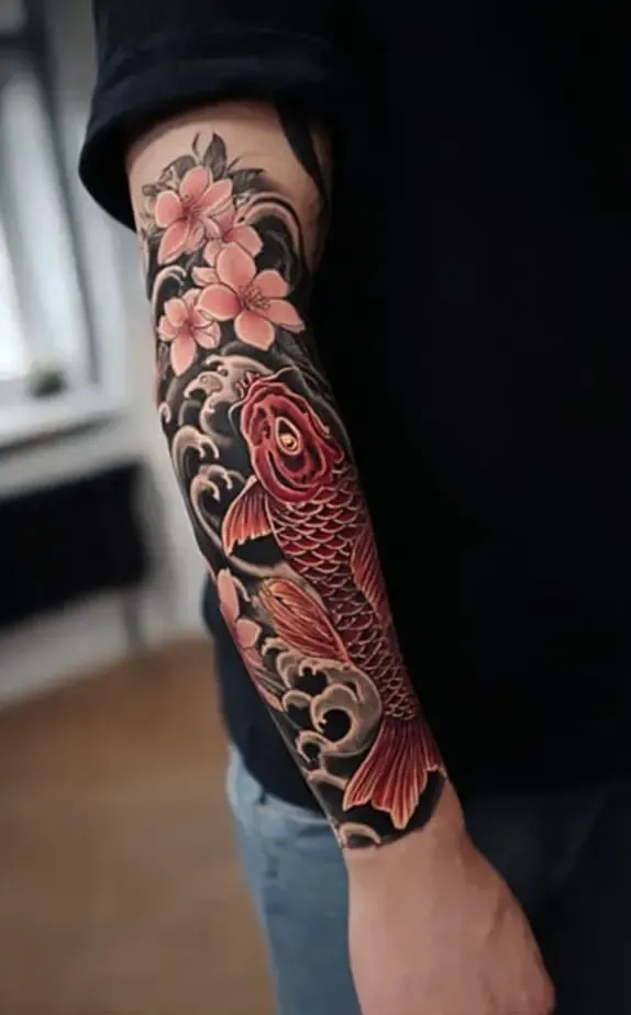 3. Japanese koi fish and cherry blossom half sleeve tattoo