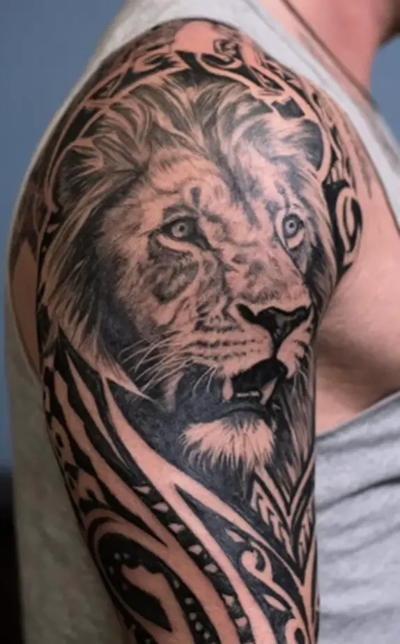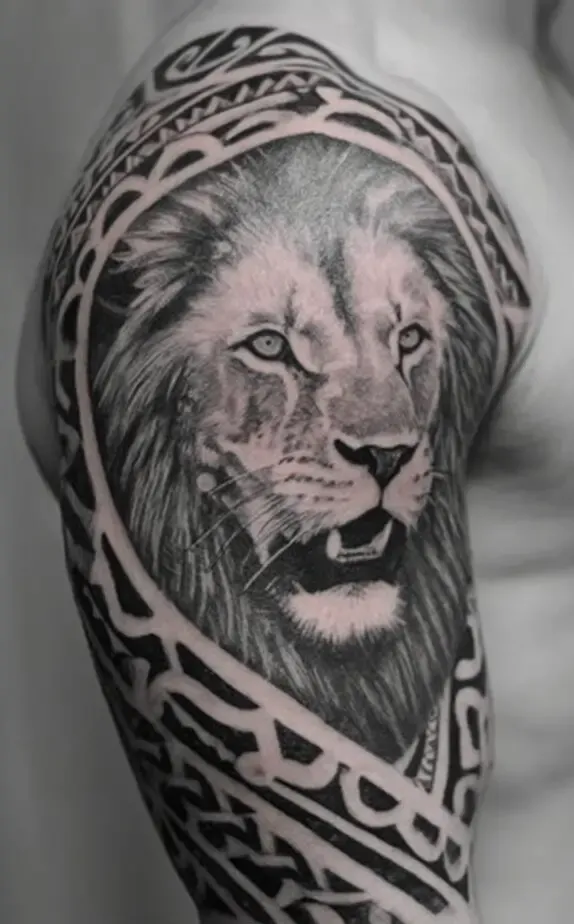 The tribal elements frame the portrait beautifully, emphasizing the lion s majestic presence while connecting to heritage and primal energy, making the tattoo a stunning statement piece with both artistic and symbolic depth.