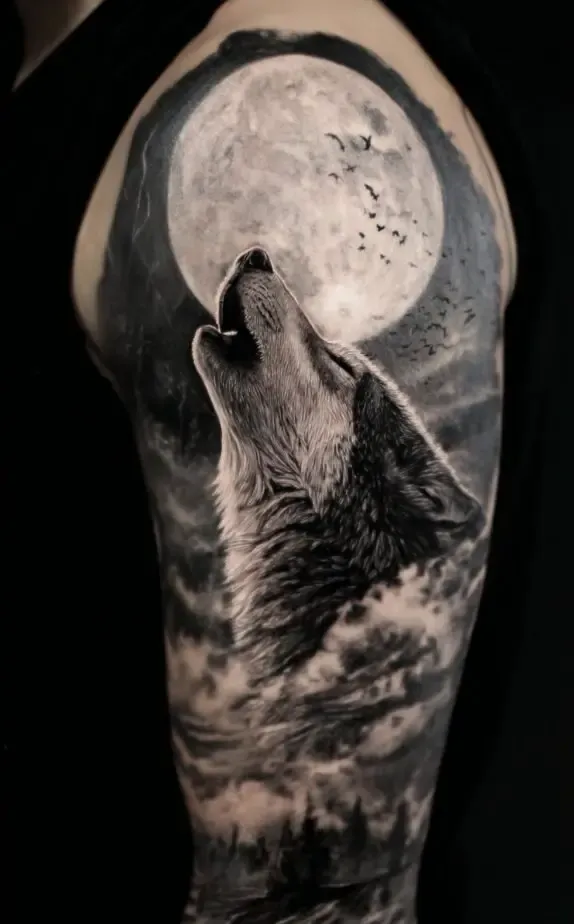 A wolf howling at the moon tattoo is a deeply symbolic design that resonates with themes of independence, strength, and spirituality.