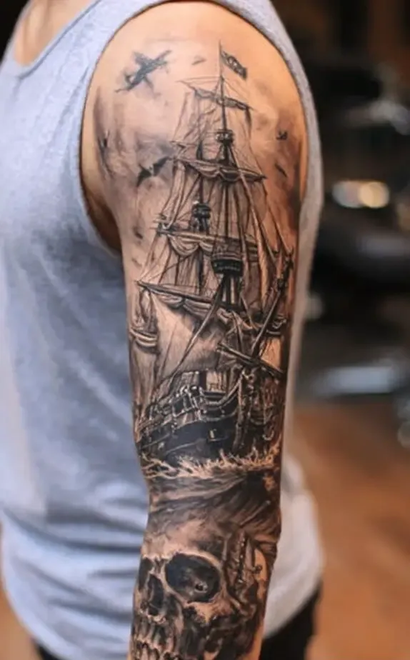 A pirate ship tattoo embodies the spirit of adventure, freedom, and rebellion on the high seas. Historically associated with outlaws who lived by their own rules, pirate ships symbolize a fearless and independent lifestyle, charting one s own course through life s turbulent waters.