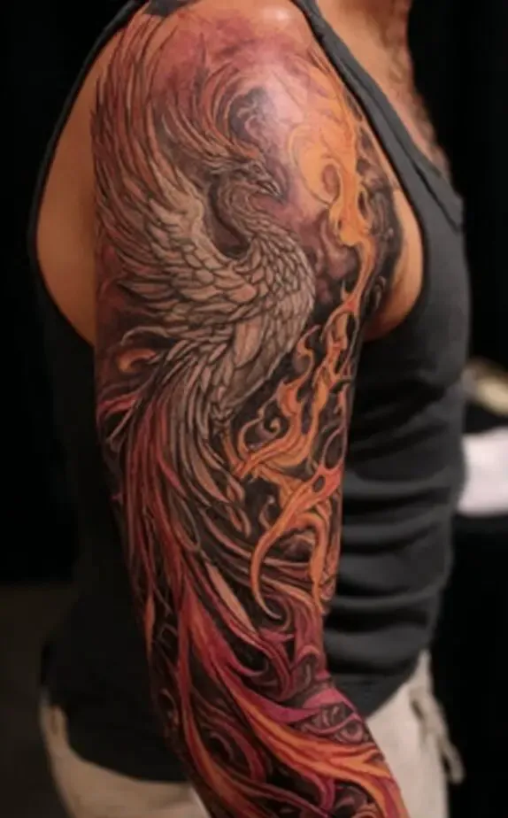 A phoenix rising with flames tattoo is a stunning symbol of rebirth, transformation, and resilience. Rooted in ancient mythology, the phoenix is known for consuming itself in fire only to rise anew from its ashes, stronger and more radiant than before.