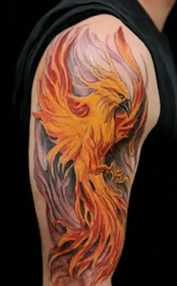 This fiery imagery represents overcoming adversity, personal growth, and the power of renewal. The flames surrounding the phoenix add a dynamic energy to the tattoo, symbolizing passion, strength, and eternal life.