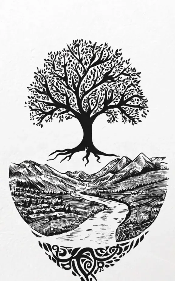 Imagine the Tree of Life growing from or blending seamlessly with mountain peaks and flowing rivers. The roots can appear as part of the riverbanks or foothills, symbolizing strength rooted in nature s enduring elements and life s continuous flow. This design evokes harmony between growth, stability, and the natural world s cycles.