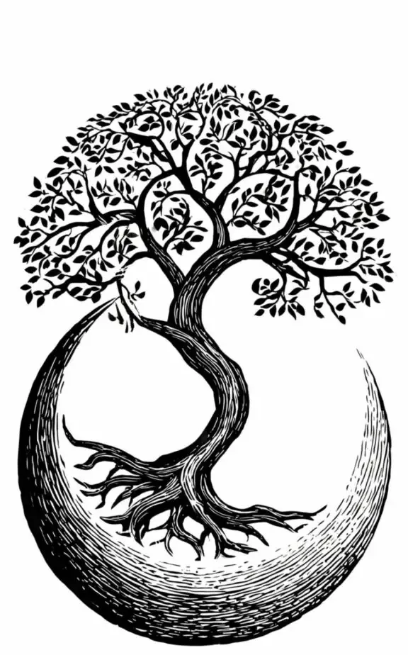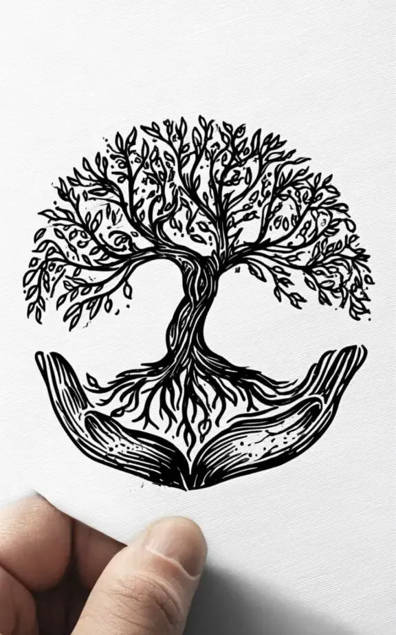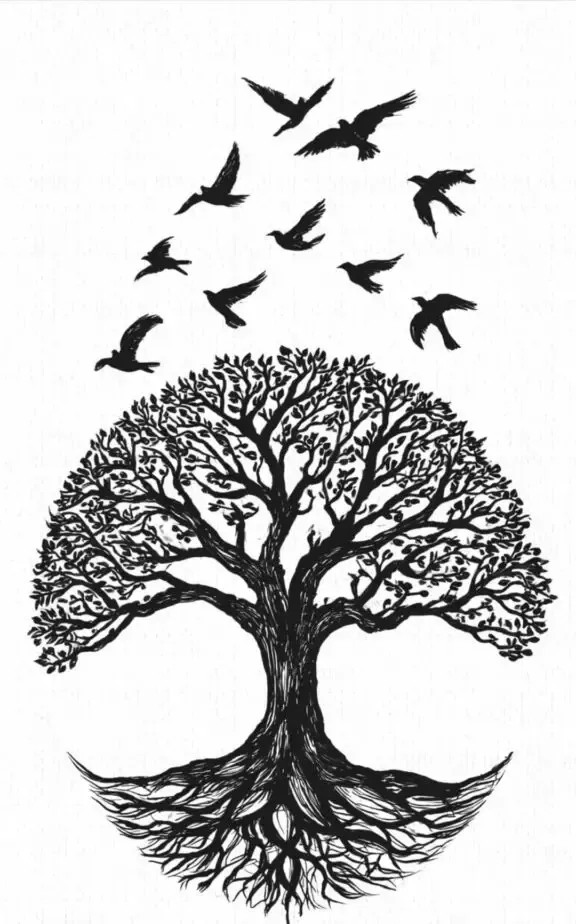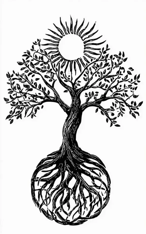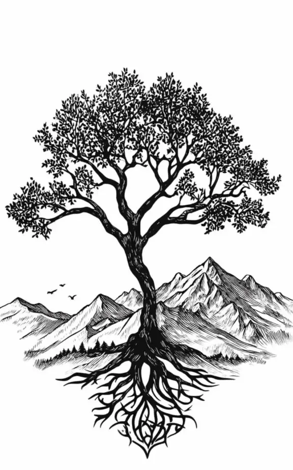 The branches reaching skyward reflect growth and aspiration, while the roots digging into the earth represent grounding and origins.