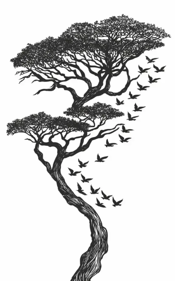 Using butterflies or birds in flight to create the tree s canopy embodies themes of transformation, freedom, and the soul s journey. These elements add movement and lightness, contrasting with the solid tree trunk and roots, and visually narrate metamorphosis and ascent.