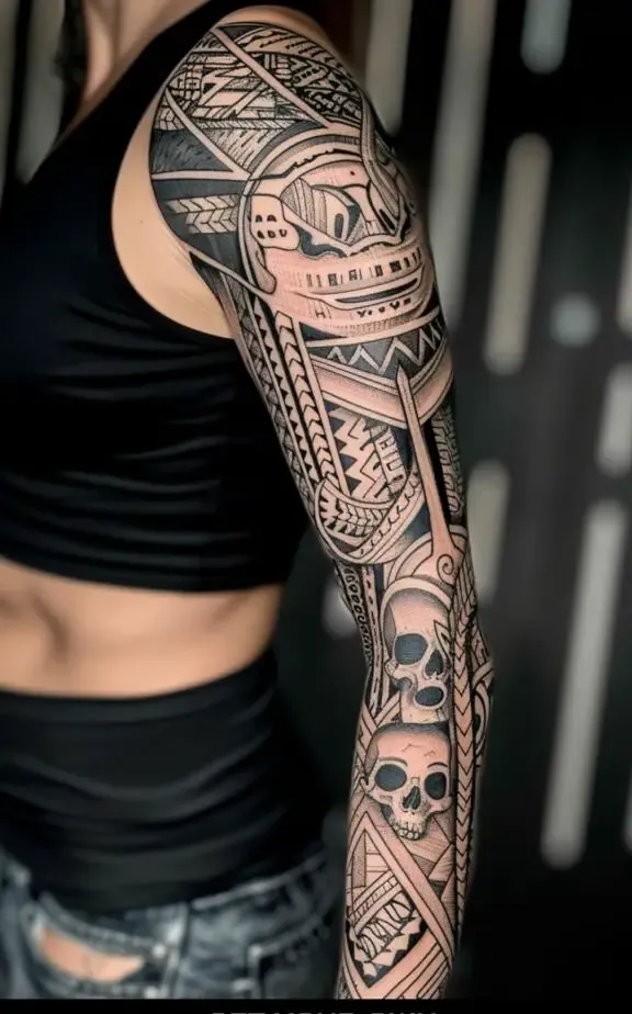 - Mix of Symbols and Patterns: Combining various Aztec symbols, such as the sun calendar, feathers, and warrior masks, into a detailed sleeve design.