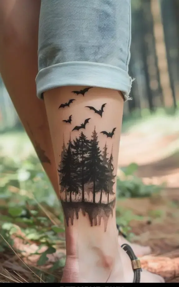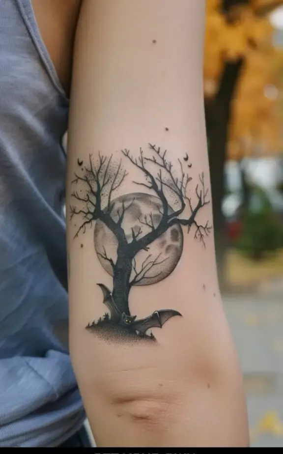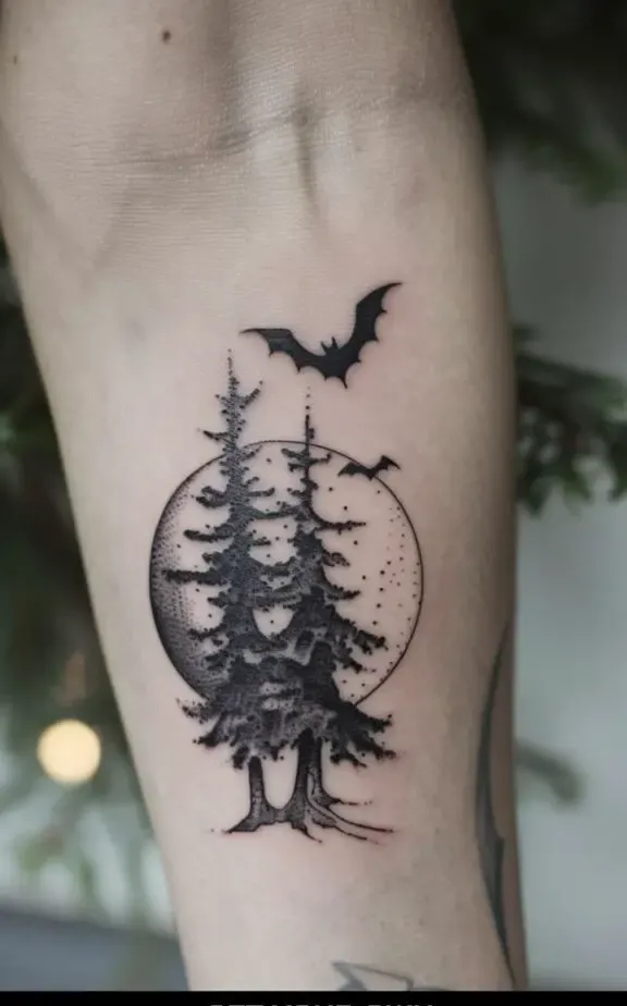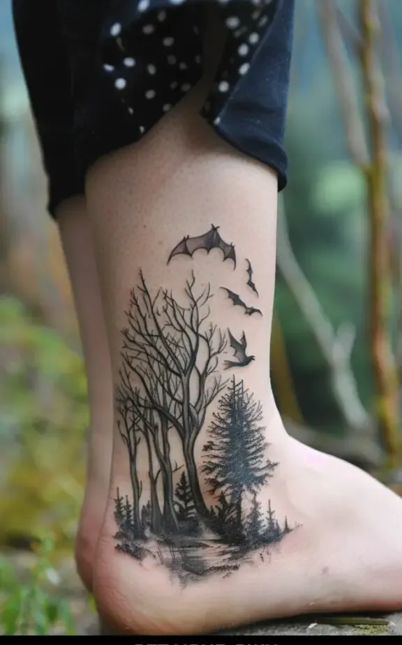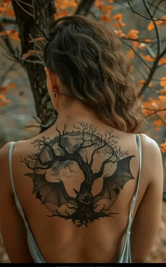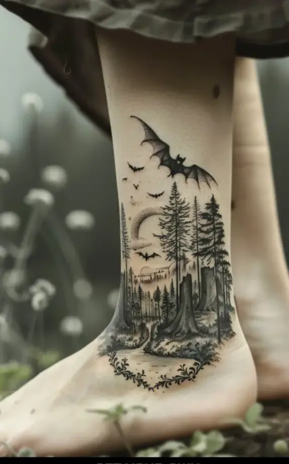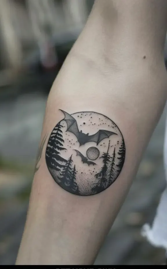 A bat flying among trees or perched on a branch creates a compelling and nature-inspired design. This tattoo can represent a connection to the natural world, freedom, and the mystery of the night. It s a versatile design that can be placed on the back, thigh, or arm.