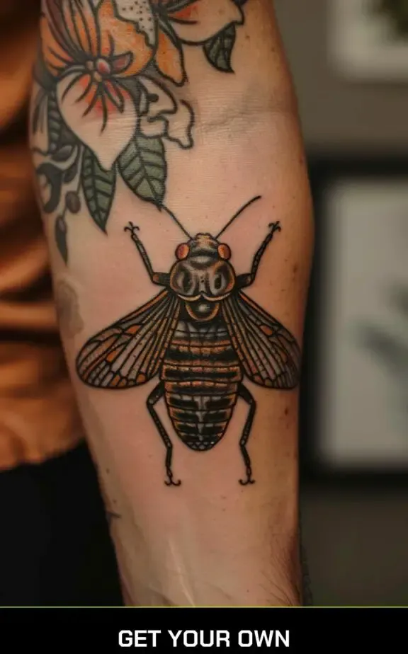 Symbolizing rebirth, immortality, and the passage of time, cicada tattoos are known for their detailed and intricate designs. They can be depicted in realistic, geometric, or dotwork styles.