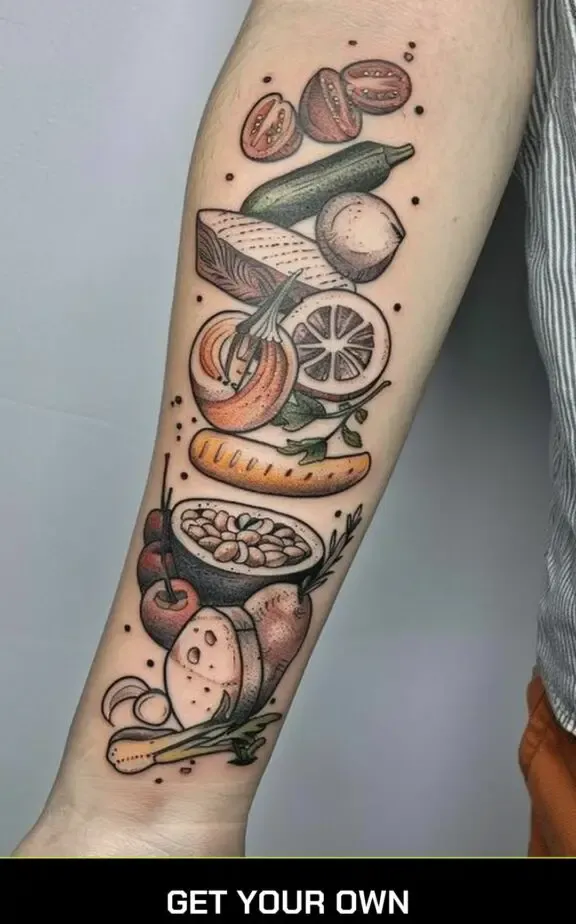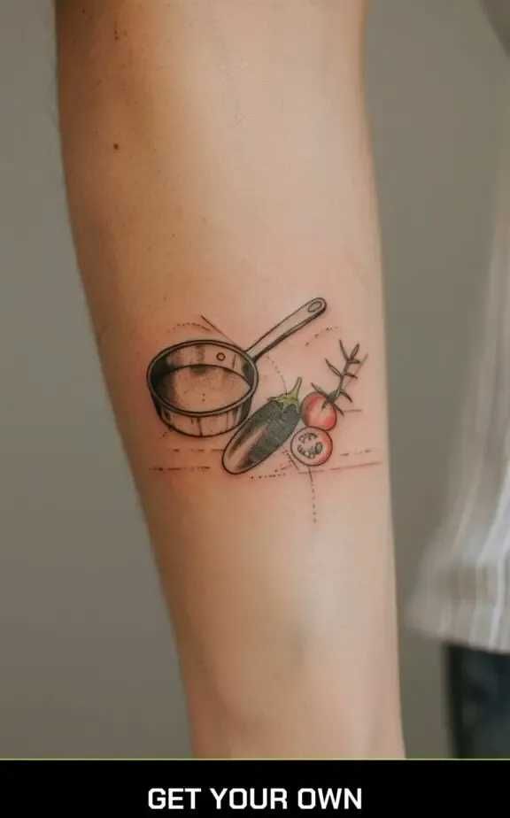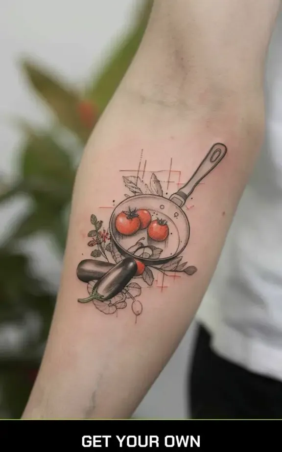 Showcase your favorite ingredients with tattoos of fresh produce, herbs, or spices. Popular choices include vibrant vegetables like tomatoes, peppers, and eggplants, aromatic herbs like basil and rosemary, and exotic spices like saffron and star anise.