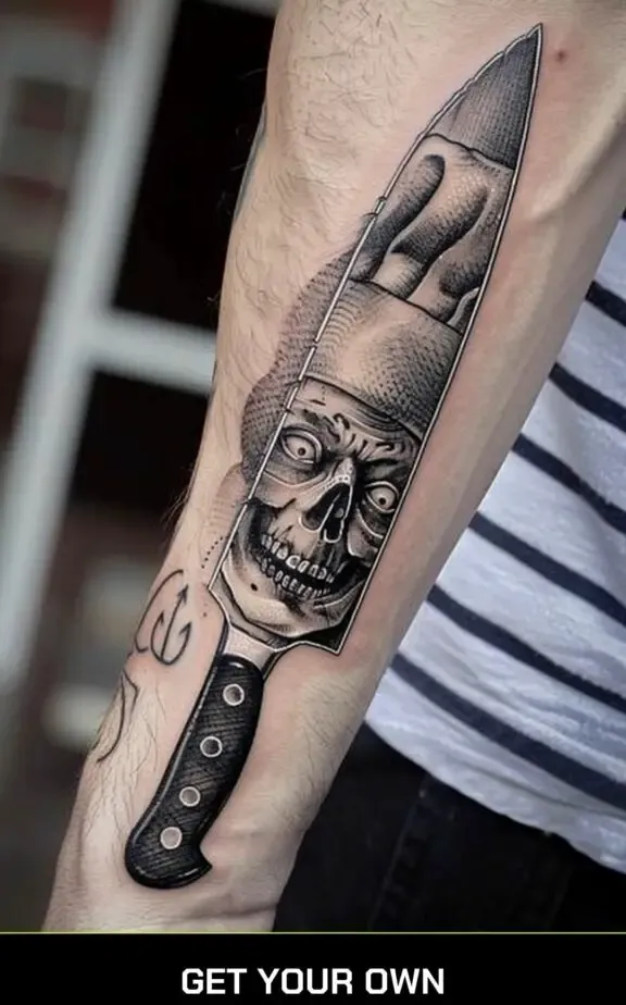 The chef s knife is an essential tool in the kitchen, symbolizing precision, skill, and mastery. Knife tattoos can be simple and elegant or detailed and intricate, often depicted with additional elements like flames, herbs, or banners with culinary phrases.