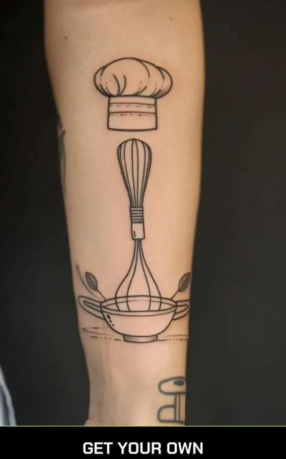 From whisk to rolling pin, kitchen utensils make for unique and meaningful tattoos. These designs can highlight specific tools that hold personal significance or represent a broad range of culinary techniques.