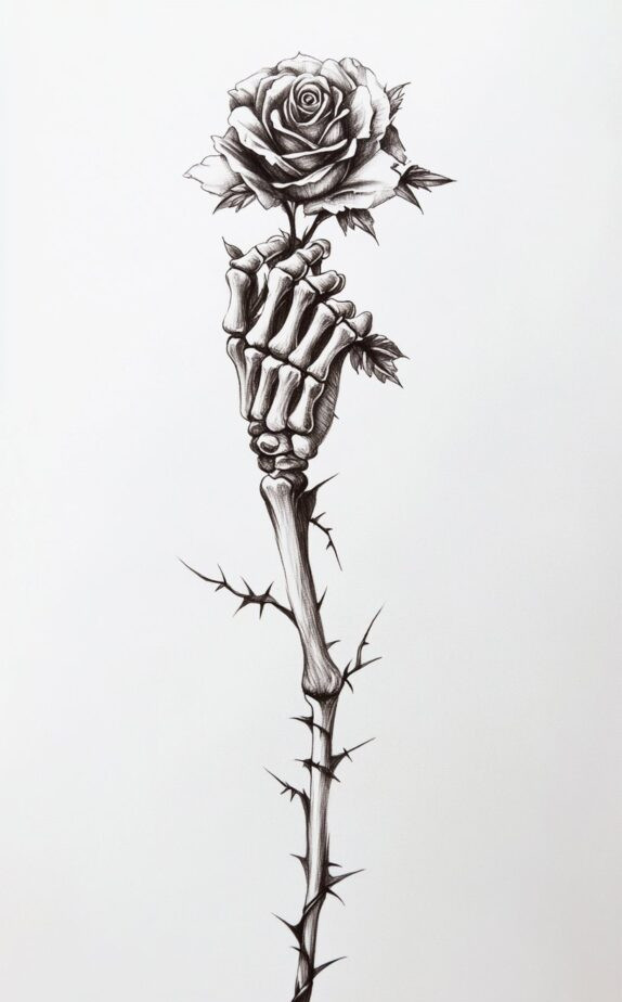 This striking image of a skeletal hand clutching a rose merges themes of life and death. The rose, blooming at the end of a skeletal arm, symbolizes beauty that endures even in the face of mortality. It s a reminder of the beauty that can be found within struggle and hardship, a core aspect of Chicano culture s resilience. The thorns along the stem represent the challenges that come with growth and strength. This tattoo design captures the duality of fragility and strength, offering a powerful message about embracing life s difficulties with grace and perseverance.