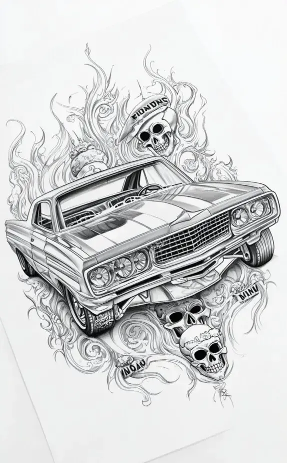 A classic lowrider tattooed with skulls and intricate designs is quintessential Chicano imagery. The lowrider, a symbol of pride and identity, rolls with the powerful presence of skulls often representing the connection between life and death. Flames and smoke surrounding the car create movement, making this design feel like a moment frozen in time. This tattoo honors heritage, the open road, and the spirit of adventure, balancing respect for life with an acknowledgment of mortality.