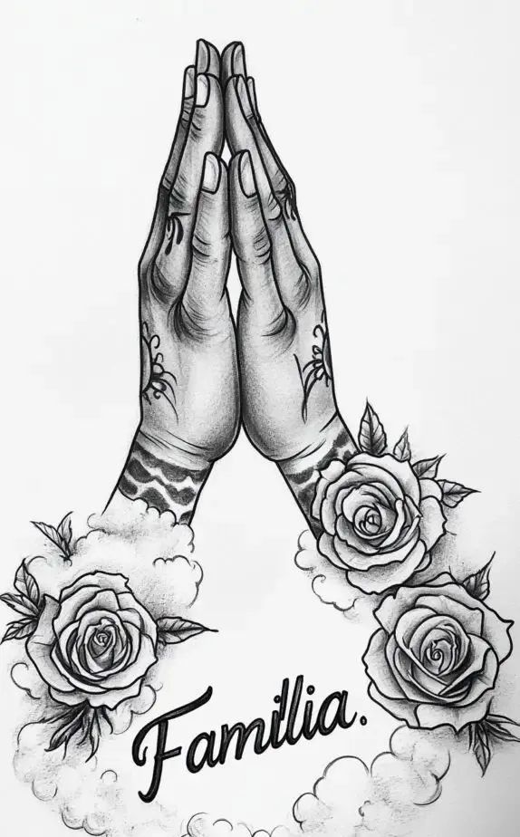 The praying hands tattoo, accompanied by the word Familiaâ and rose accents, represents faith, family, and respect for tradition. This iconic symbol in Chicano culture is deeply meaningful, showcasing the importance of family bonds and spirituality. The roses surrounding the hands add a softness to the design, blending reverence with beauty. This tattoo serves as a reminder of one s roots, often used to express a commitment to family values and a prayer for protection and unity. It s a design that resonates with those who hold their loved ones and faith close to their hearts.