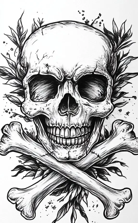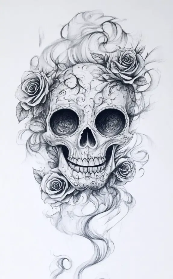 This tattoo design features a skull entangled in floral elements, merging death with beauty. Roses often symbolize love, and pairing them with a skull speaks to the coexistence of love and loss. The delicate details around the skull contrast with its hollow eyes, capturing an eerie yet romantic aesthetic. Chicano art frequently emphasizes such dualities, honoring both life and death as inseparable forces. This intricate black-and-white design, with its flowing lines and soft shading, exemplifies the emotional depth and respect for mortality seen in Chicano tattoo art.