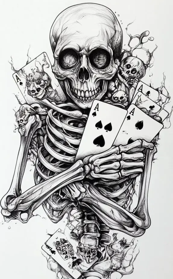 A powerful representation of life s gamble, this skeleton clutching aces symbolizes the risks and unpredictability in life. The skeletal figure, deeply detailed and expressive, is surrounded by cards and smaller skulls, indicating both luck and danger. This tattoo design uses bold shading and intricate linework, creating a compelling visual narrative of chance and fate. Often, Chicano art incorporates skeletons to reflect the proximity of life and death. This piece is a vivid portrayal of those who live on the edge, embracing fate with a fearless attitude, typical of the resilient Chicano spirit.