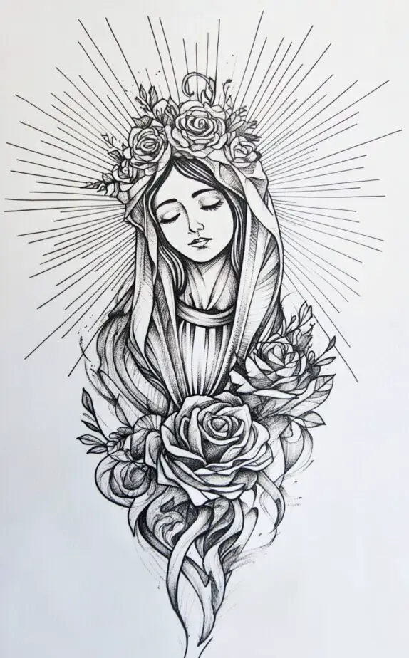 This design of the Virgin Mary, adorned with roses and beams of light, embodies spiritual reverence. The Virgin Mary holds a prominent place in Chicano art, representing faith, protection, and cultural identity. Her gentle expression and the floral details create a feeling of peace and sanctity. For many, this tattoo acts as a shield, a reminder of guidance and divine presence in life s journey. The shading techniques bring a softness that makes the design both graceful and profoundly meaningful.