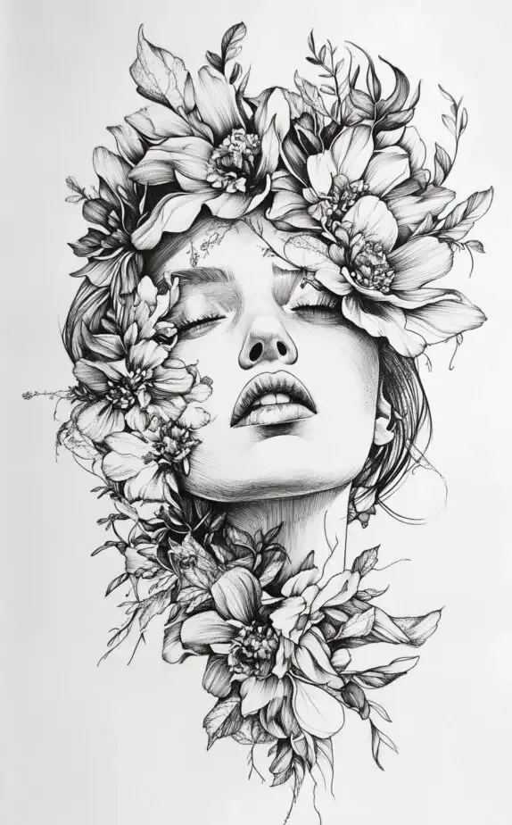 This beautiful design features a woman s face encircled by blooming flowers, capturing both elegance and resilience. The soft, delicate details in the petals juxtapose with the bold, structured lines of her face, blending grace and strength. Flowers in Chicano tattoos often represent growth, beauty, and femininity, and here they frame the woman as an emblem of nature s nurturing and enduring qualities. This design is ideal for those who seek a blend of floral beauty with deep cultural significance, celebrating femininity, growth, and life s fragility.