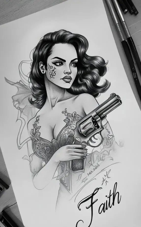 This powerful depiction of a woman holding a gun with Faithâ inscribed beneath captures the Chicano spirit of resilience and strength. The character exudes confidence and loyalty, reflecting a protective nature often found in Chicano culture. The intricate details, from her flowing hair to the patterns on her dress, highlight her allure and strength. This design merges beauty with a fierce edge, symbolizing the devotion to protecting loved ones and standing up for one s beliefs. It s a unique blend of femininity and power, embodying both loyalty and an unbreakable spirit.