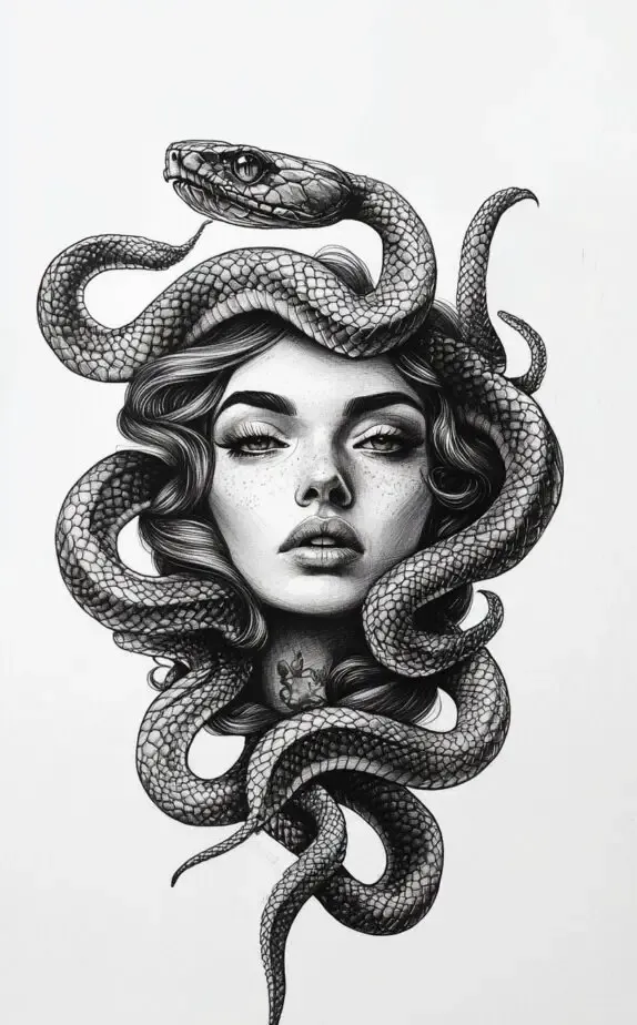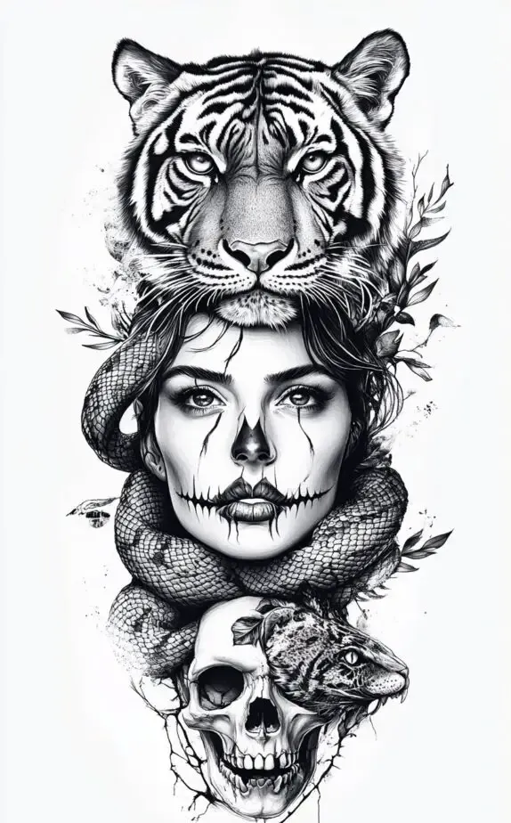 This powerful image portrays a woman adorned with a tiger headdress and a snake coiled around her neck, symbolizing strength, wisdom, and protection. The tiger s fierce gaze and the snake s intricate scales add a sense of majesty and power to the design. In Chicano art, animals like tigers and snakes often represent guardianship and resilience. This tattoo merges bold linework with softer shading to create depth, making it an impactful representation of inner strength and courage, ideal for those who value resilience and the spirit of survival.