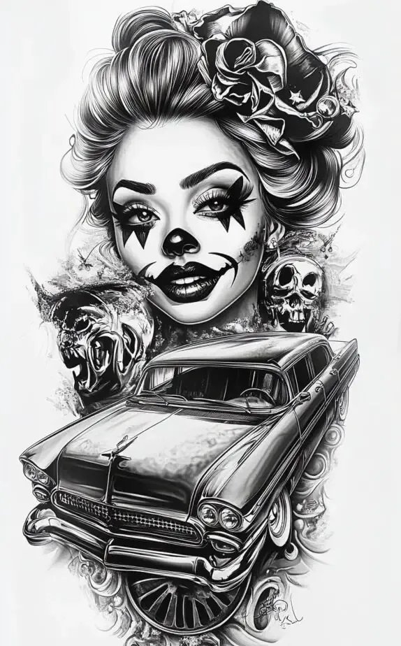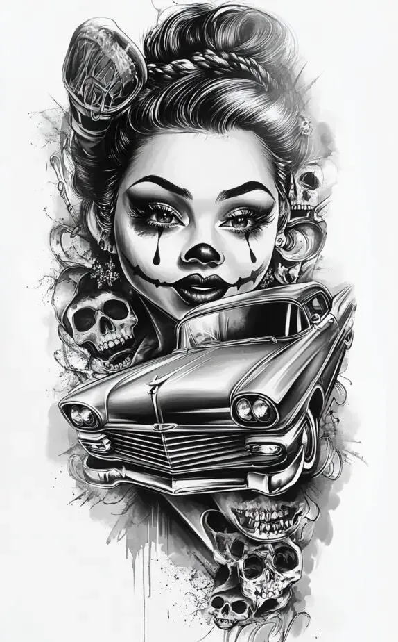 This tattoo portrays a woman with traditional clown makeup beside a lowrider car, embodying the essence of Chicano culture. The bold makeup, dramatic shading, and iconic car represent pride in heritage and a connection to community roots. The lowrider, an iconic symbol in Chicano culture, adds a personal and cultural narrative. This design resonates with those who identify with the strength, resilience, and spirit of the Chicano community. The intensity of the woman s gaze and the vintage car are reminders of identity, history, and pride in one s heritage.