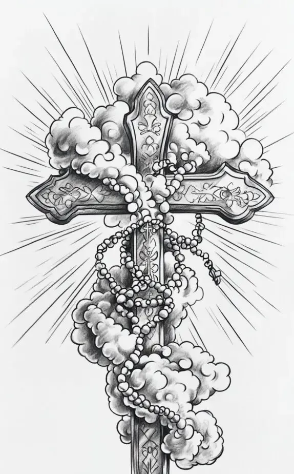 The cross with a rosary and clouds surrounding it embodies deep religious devotion, a key theme in Chicano culture. The rays behind the cross give the image a divine, radiant effect, symbolizing the protection and guidance of faith. The rosary draping around the cross adds a layer of spiritual symbolism, often representing prayers for peace and blessings. This tattoo design resonates with those who find strength in their faith, serving as a reminder of the values they hold sacred. The soft clouds add a heavenly element, elevating the spiritual essence of the design.