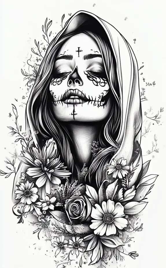 This Chicano tattoo drawing combines beauty and mortality in a captivating style, featuring a woman adorned with skeletal facial details framed by blooming flowers. The delicate floral arrangements juxtaposed with the skull-like makeup embody the theme of La Vida y La Muerteâ life and death central to Chicano art. This design draws inspiration from DÃa de los Muertos (Day of the Dead), symbolizing remembrance and celebration of life. The black-and-white ink captures the intensity and grace that define Chicano tattoo artistry, adding a haunting yet beautiful aesthetic.