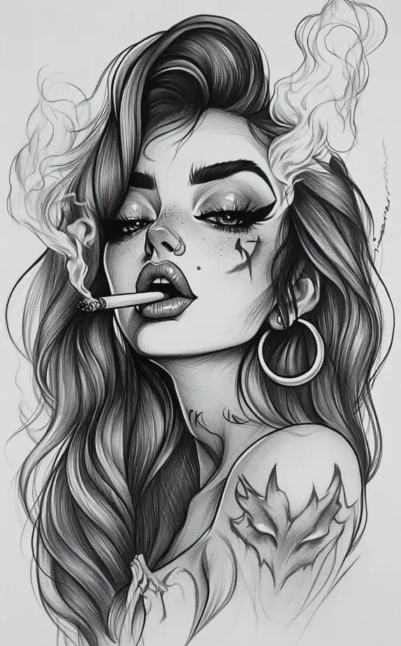 This striking tattoo features a classic Chicano femme fatale, her expression cool and self-assured. The smoke drifting from her cigarette adds a dramatic, almost noir-like effect. Bold lashes and pronounced features give her a sultry, fierce look. Tattoos like these often symbolize strength, resilience, and beauty amidst adversity. The detailing of her facial features, combined with subtle shading, captures the essence of Chicano art s intensity, blending realism with an almost cinematic style.