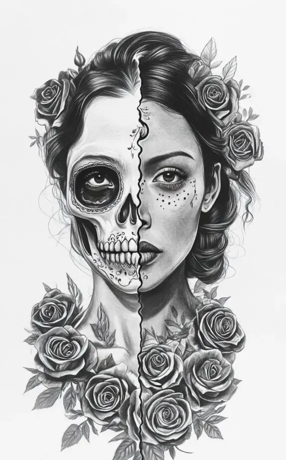 This striking Chicano tattoo design features a woman s face split down the middle, half alive and half depicted as a skull. This contrast symbolizes the delicate balance between life and death, a recurring theme in Chicano art. The detailed roses surrounding her add an element of beauty, often representing love and respect for those who have passed. The seamless transition from life to death highlights both beauty and impermanence, reminding the viewer of the closeness of life and mortality. This tattoo is both haunting and beautiful, embodying the resilience and cultural depth of Chicano art.