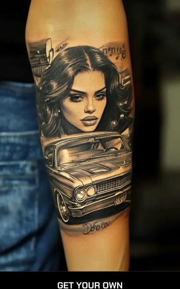 Lowriders are an iconic part of Chicano culture, symbolizing pride, creativity, and rebellion. A tattoo featuring a classic lowrider car, often with elaborate detailing and vibrant colors, pays homage to this unique cultural expression.