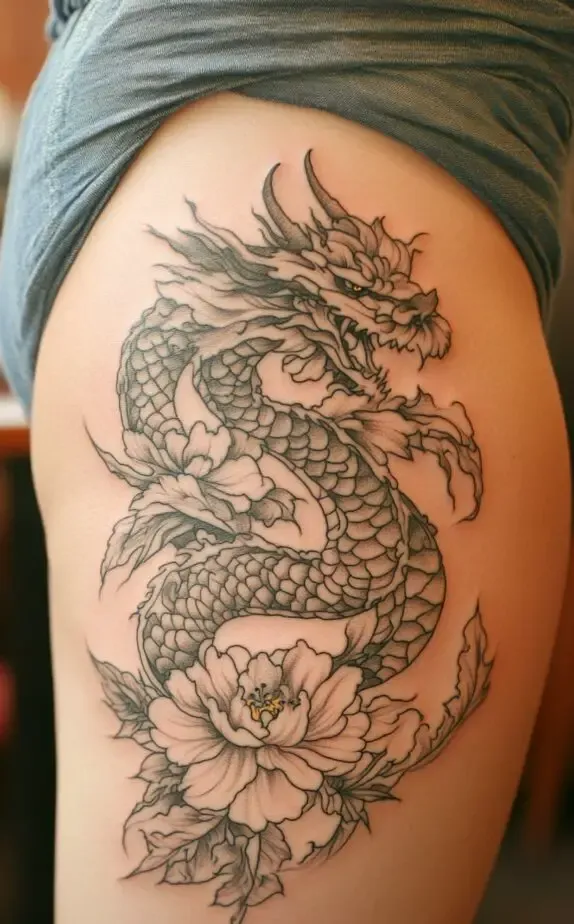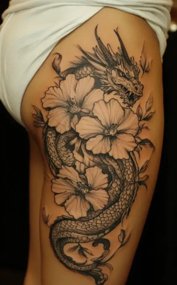 Combining the mythical with the natural, this tattoo features a dragon entwined with blooming flowers. The dragon represents power and mystery, while the floral elements add balance, making the design both strong and beautiful.