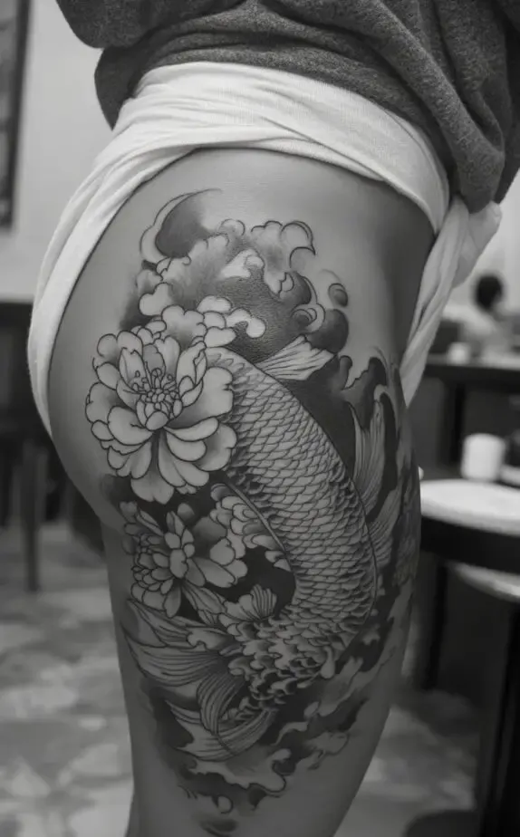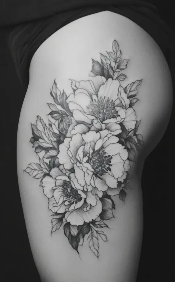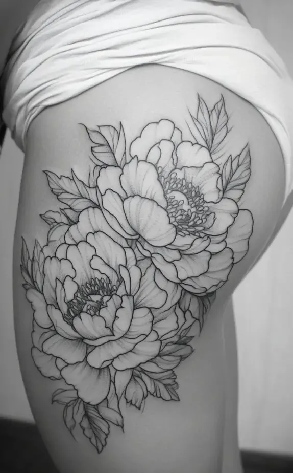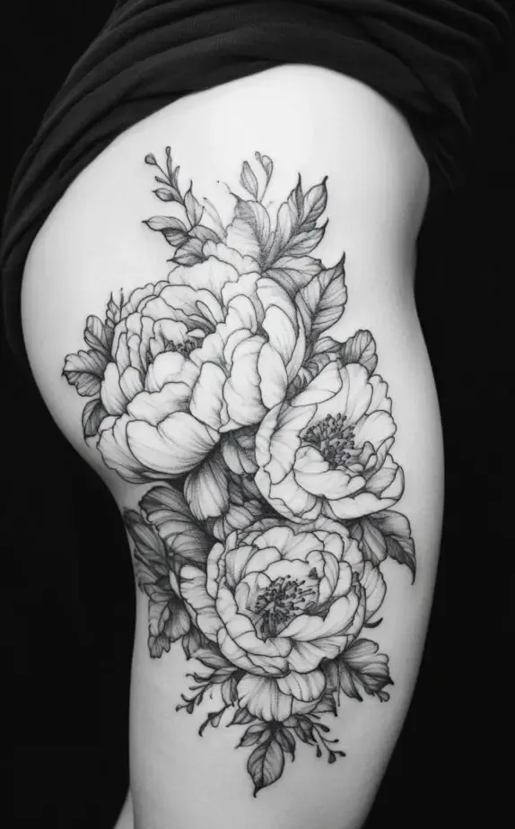 For those who prefer a minimalist aesthetic, the black and grey palette of this tattoo makes it versatile and timeless. The shading work provides depth, while the peonies arrangement highlights the contours of the hip. This piece is a beautiful choice for anyone looking for an understated yet impactful tattoo.