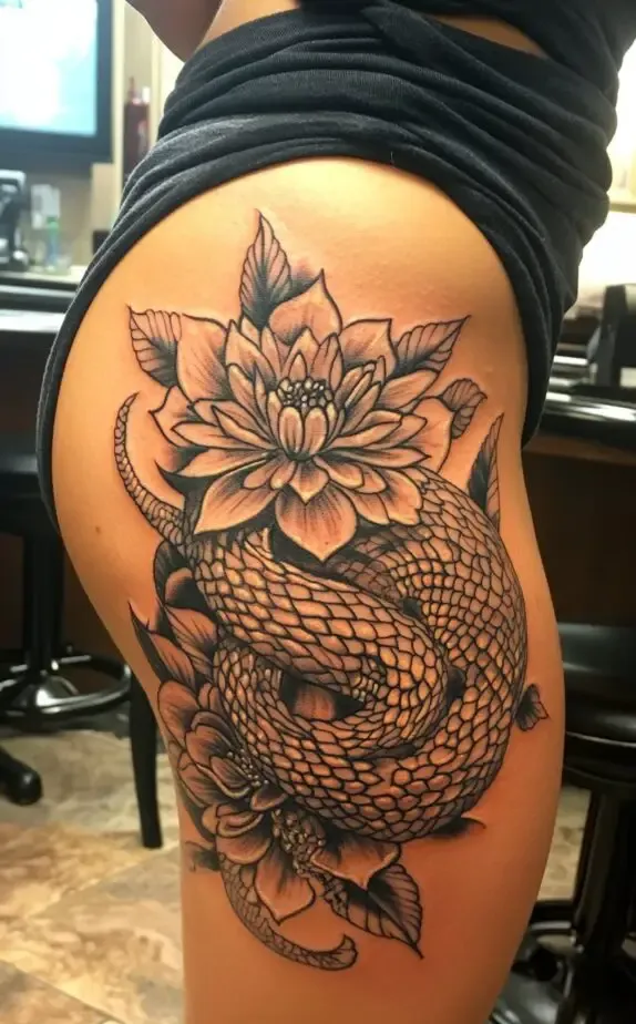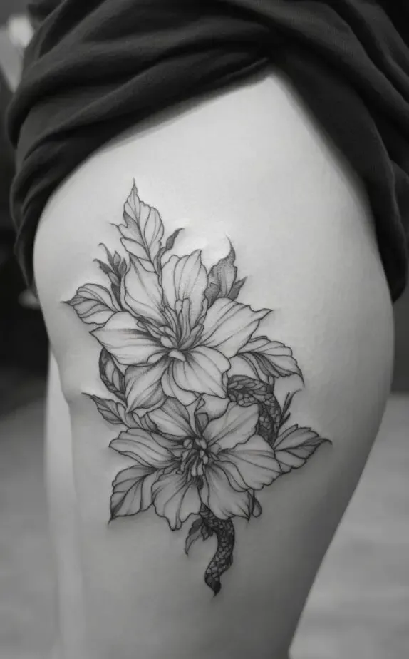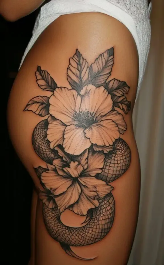 Combining strength and elegance, this tattoo merges a serpent with floral elements, creating a dynamic and fierce design. The snake winds around the flowers, signifying rebirth and resilience, while the blossoms bring in a soft, feminine contrast. This tattoo highlights the duality of nature, showcasing both strength and grace.