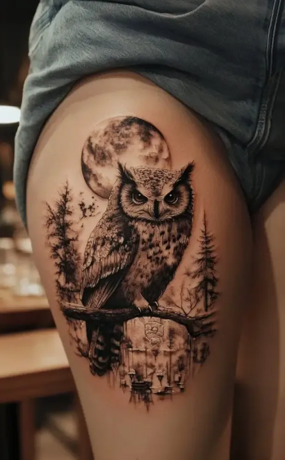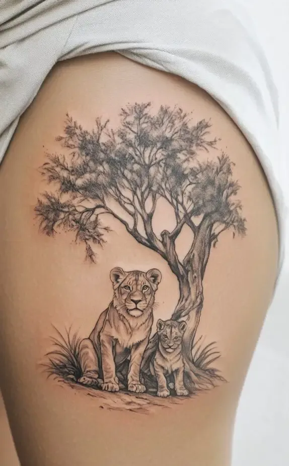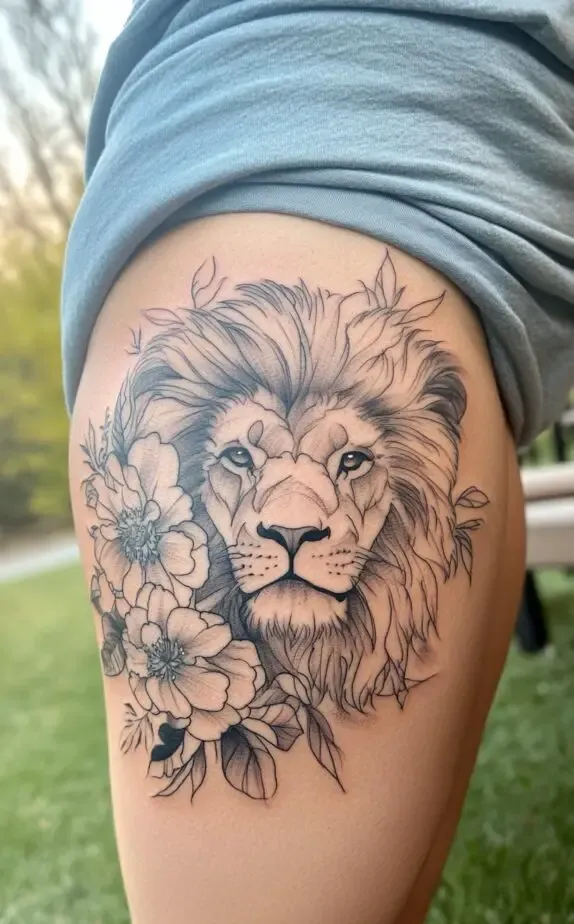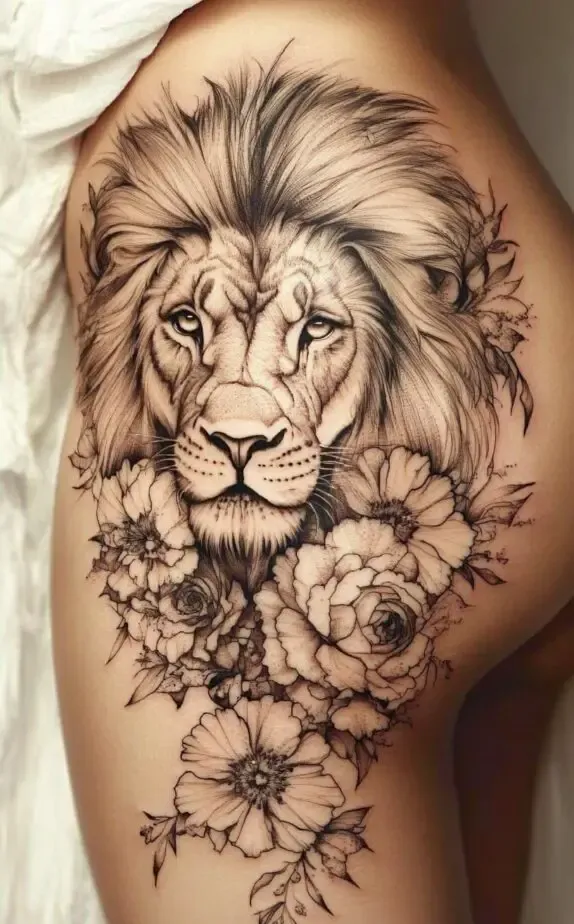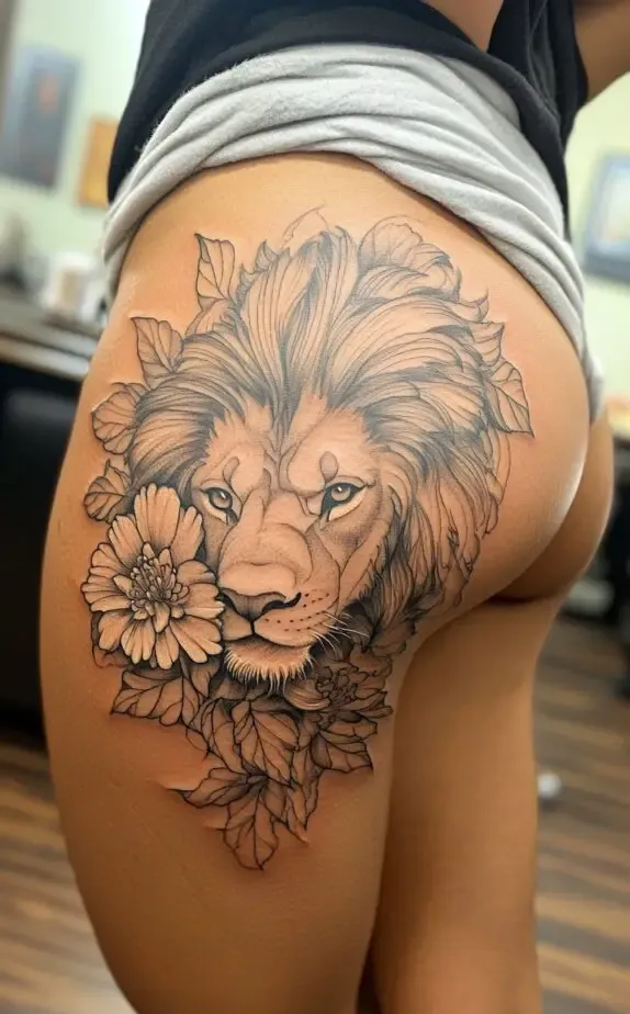 This design can be a powerful symbol of inner strength, independence, and beauty. For women seeking a tattoo that embodies resilience with elegance, this combination of wildlife and flora on the hip offers a striking and meaningful choice.