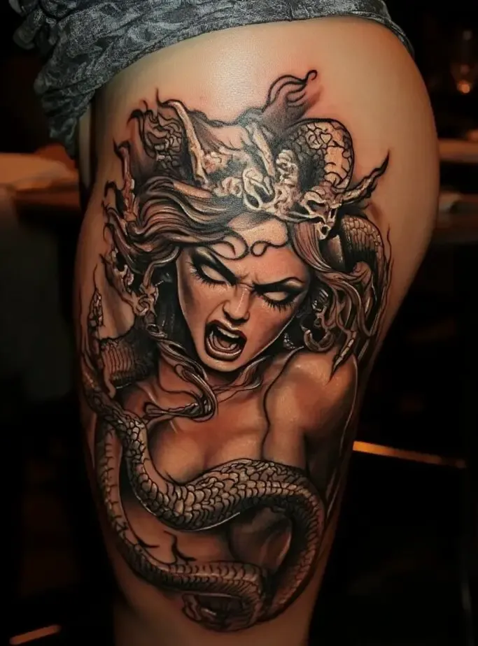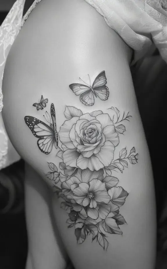 This tattoo is ideal for women looking to incorporate symbols of transformation and beauty. The hip placement allows the design to move naturally with the body, creating a dynamic piece that is both powerful and graceful.