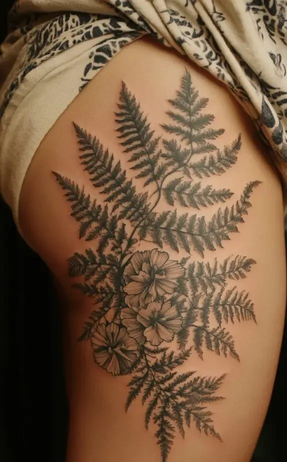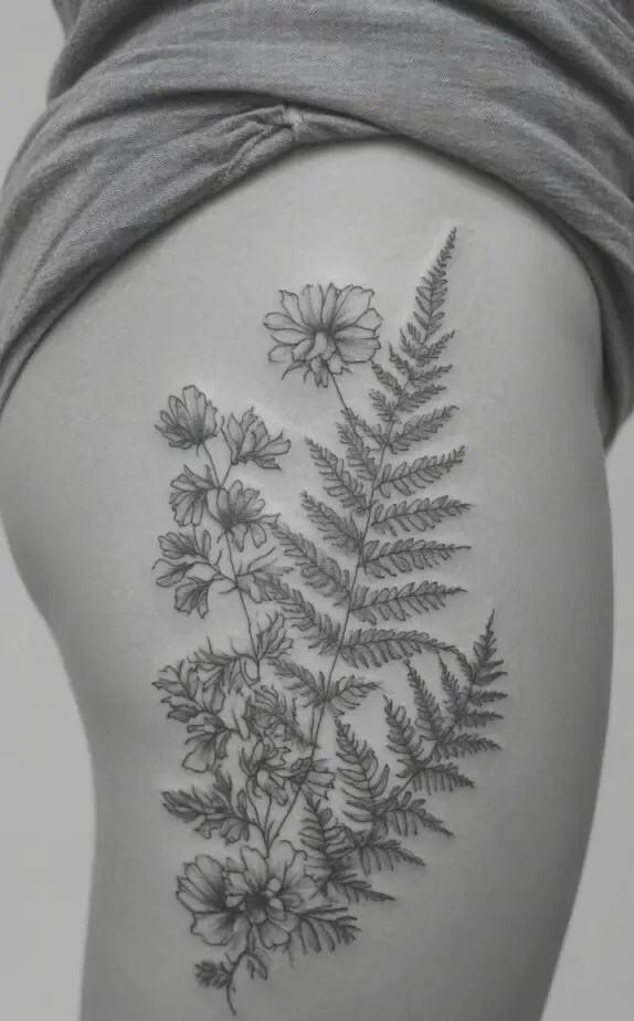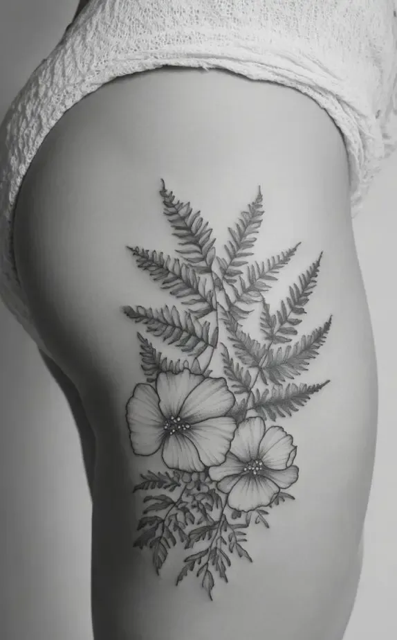 Bringing an earthy and organic feel, this tattoo combines delicate wildflowers with intricate fern leaves. The detailed line work creates a texture that mimics the natural look of ferns, making it an ideal design for nature lovers. The flow of the tattoo across the hip adds movement, making it look like a gentle breeze is passing through the leaves.