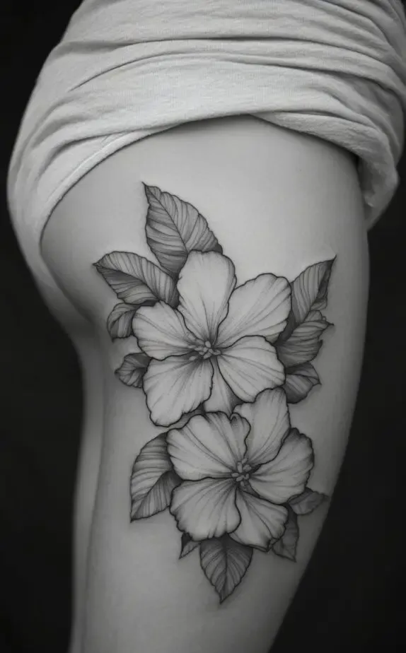 This tattoo captures the beauty of the hibiscus flower with meticulous detail, using fine lines and shading to bring the petals to life. The design flows naturally across the hip, accentuating the body s curves.