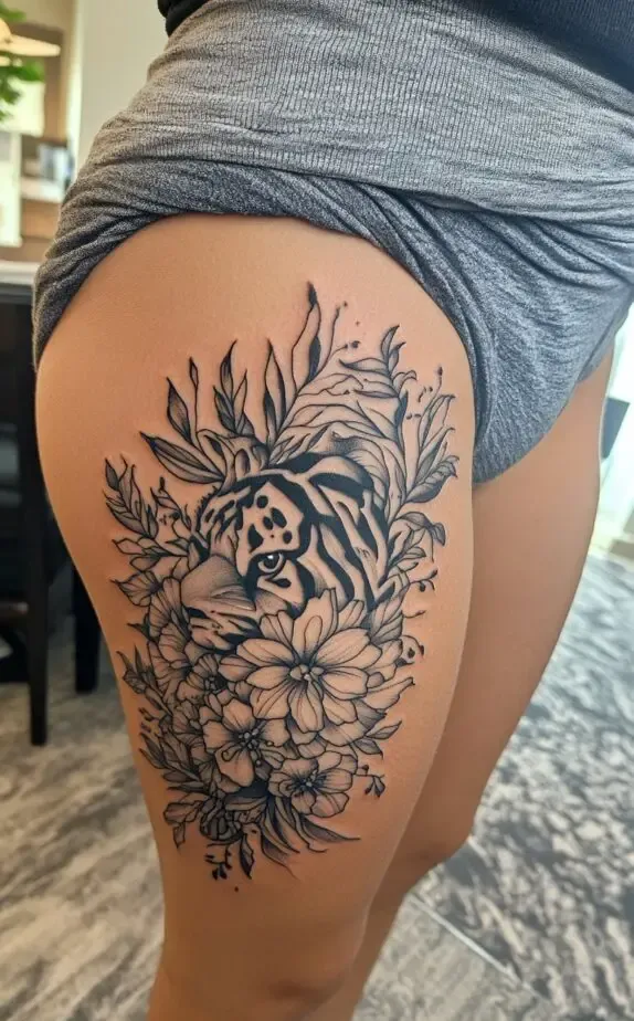 A striking tiger surrounded by flowers offers a powerful contrast between strength and beauty. This tattoo captures the raw energy of the tiger, symbolizing courage, while the floral elements soften the overall look, adding balance and harmony.