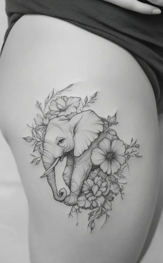 This unique design combines the gentle strength of an elephant with soft floral elements. The delicate linework around the elephant brings out its kind expression, while the flowers add a touch of gentleness and warmth.